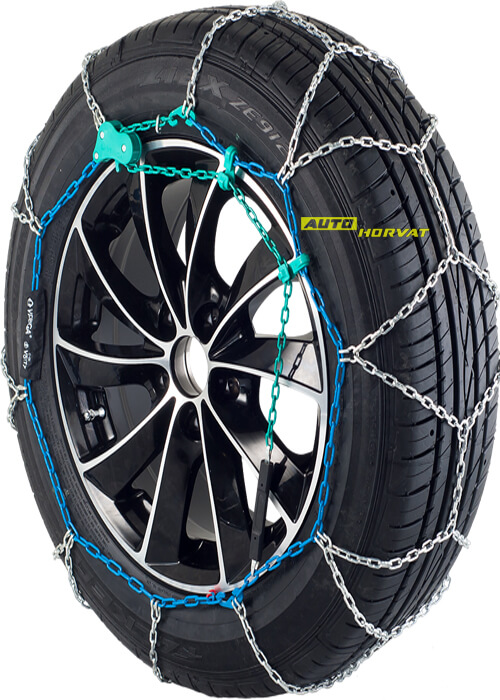 Lanac 9 mm s ručnim zatezanjem, izvrsne kvalitete koja omogućava dugotrajni vijek trajanja i pouzdanost u ekstremnim situacijama. Odobreno u skladu sa standardom ON V5117. Gazna površina u dijamantnom uzorku, izrađena od posebnog legiranog čelika, sa karikama u D izvedbi za sigurno prianjanje po snijegu i ledu. Visokokvalitetna toplinska obrada materijala - pougljičavanje. Ergonomski dijelovi, obilježeni bojama, koji dolaze sa jasnim uputama za uporabu te plastične rukavice omogućavaju brzu, jednostavnu i čistu montažu.