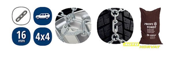 Lanac 16 mm namijenjen terenskim vozilima, za univerzalnu i profesionalnu uporabu, prikladan za šumske terene. Najbolje rješenje za najzahtjevnije uvjete. Gazna površina izrađena od guste mreže napravljene od posebnog legiranog čelika sa karikama debljine 4,5 mm u izvedbi D. Visokokvalitetna toplinska obrada materijala - pougljičavanje. Idealno za uporabu na snježnim i ledenim cestama, blatnjavim i kamenitim putevima, prekrivenim granjem i korijenjem. Izvrsno prianjanje i udobnost tijekom vožnje. Namijenjeno terenskim šumskim, policijskim i vojnim vozilima i vozilima za lov. Isporučuje se u čvrstim torbama od nepropusnog materijala.  |