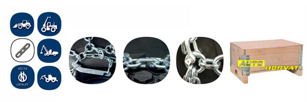 Lanac izrađen u gušćoj Kara izvedbi, namijenjen za profesionlnu uporabu na poljoprivrednim strojevima u svim zimskim uvjetima. Idealan za teške dizalice kod kojih je najvažnije dobro prianjanje. - Karike lanca mogu biti debljine 7, 8 . 9.5 ili 12 mm u "D" profilu. - Visokokvalitetna toplinska obrada materijala - pougljičenje. Potpuno pocinčan. - Lanac upotrebljavamo na obje strane što produžuje vijek trajanja. - Unutarnja strana lanca je sa podesivim okovima za optimalno prilagođavanje gumi. - Opremljen lancem i kukom za zatezanje te sa podesivim okovima za bolje prilgođavanje gumi. - Gazni dio lanca i bočni povezuju vareni članci. - Odobreno u skladu sa standardom ON V5119. - Isporučuje se u čvrstoj platnenoj torbi ili drvenom sanduku, ovisno o veličini.  |