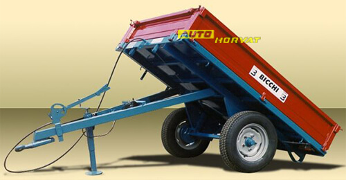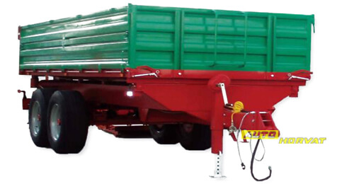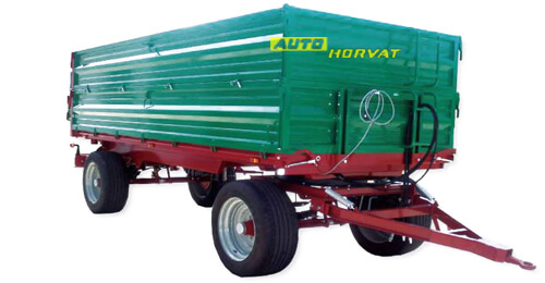 Dvosovinska prikolica. Prikolice su namenjene prvenstveno za individualni sektor. Upotrebljavaju se prije svega za transport u poljoprivredi, vinogradarstvu, stočarstvu , građevinarstvu kao i u ostalim delatnostima. U opremi prikolica ima ljestve, parkirnu nogu na reduktor, otvor za sitno zrno (šuber) + lijevak, centralno otvaranje stranica, univerzalni zatvarači stranica sa sigurnosnim sistemom, ručnu kočnicu. Kopčanje je jednostavno sa prednjom okretnom kuko koja je podesiva i po visini, Prikolica ima signalizacijska svjetla + sigurnosni trokut. |